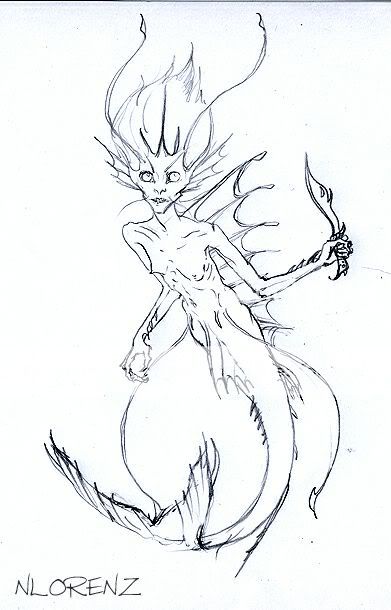http://img4.photobucket.com/albums/0803/nacey/fineart/merrowraw.jpg -- A deep sea mermaid that lives on the Abyssal Plains. Very scary looking, rather savage but noble in their own way. Coastal mermaids and Abyssal mermaids never meet. Probably a good thing too!